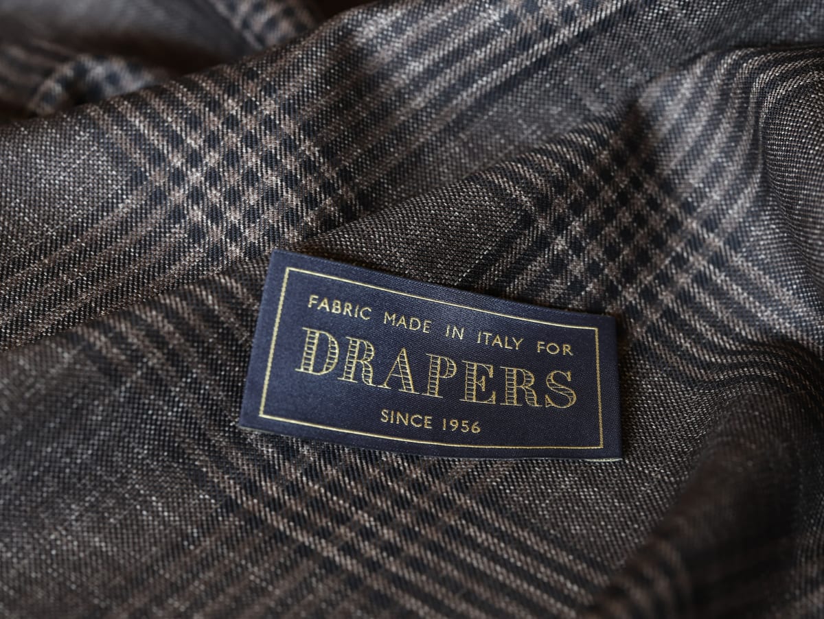 光沢感のあるやや大きめのグレンチェック。コントラストも強すぎないので合わせやすそうですね。 クリアカットでもジャケット生地とわかる柄の大きさ、色使い。気が利いてます。 ネームはドラッパー...